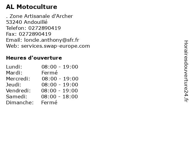 2 Dr Mohamad Al Dakkak - Pneumologue (Distance: 12,69 km) 33 rue du Haut-Roche, 53000 Laval al, consultation, dakkak, docteur, dr, med, mohamad, médecin, médecine, pneumologue, traitement 3 Ernée Motoculture (Distance: 15,62 km) Rue Zone d'activité Hainaud Querminais, 53500 Ernée ernée, espaces verts, micro-tracteurs, motoculture, tondeuses 5 Cam (Distance: 6,18 km) Rte De St Germain d Anxure, 53240 Alexain agriculteurs, cam, coop, détail, jardinage, magasins, maye, pépinières, vente 6 Agrial (Distance: 7,85 km) - rue de Saint Germain, 53420 Chailland agrial, agricole, alimentation, bricolage, jardinage |