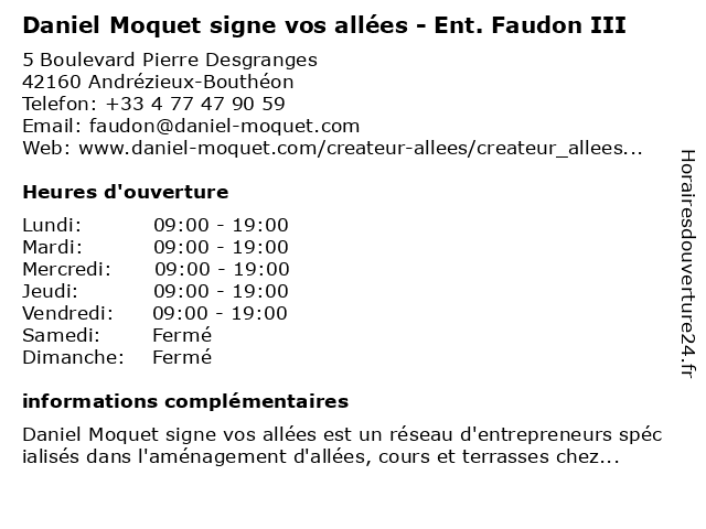 1 Daniel Moquet signe vos clôtures - Ent. Faes Aménagements (Distance: 0,00 km) 5 Boulevard Pierre Desgranges, 42160 Andrézieux-Bouthéon aménagements, carport, clôture, clôture aluminium, clôture bois, clôture composite, clôtures, daniel, daniel moquet clôtures, ent., faes, grillage rigide, moquet, pergola, pergola bioclimatique, portail, portail aluminium, portail battant, portail coulissant, portail pvc, portillon, poseur de clôtures, poseur de menuiseries extérieures, poseur de pergola, poseur de portail, signe, store banne, vos 2 Grange Daniel (Distance: 6,71 km) . Le Poizat, 42570 Saint Héand bailleurs, biens, daniel, grange, immobiliers, nra 3 PRO&Cie - Ent. Moulard & Fils (Distance: 12,88 km) 1 Rue des Écoles, 42290 Sorbiers ent., fils, moulard, pro&cie 4 GARAGE DANIEL MARTINON (Distance: 13,00 km) 15 Impasse de Roanne, 42210 Montrond-les-Bains ad, courroie de distribution, daniel, devis réparation voiture, entretien auto, garage, martinon, revision voiture, réparateur voiture, réparation carrosserie, vidange 5 Monsieur Daniel Sedoli (Distance: 13,00 km) 26 Rue Marengo, 42000 St Etienne daniel, restaurants, sedoli 6 Fayolle Fabrice Daniel Eric (Distance: 13,19 km) 5 b Rue Des Creuses, 42350 La Talaudiere boucheries, daniel, eric, fabrice, fayolle, poissonneries |