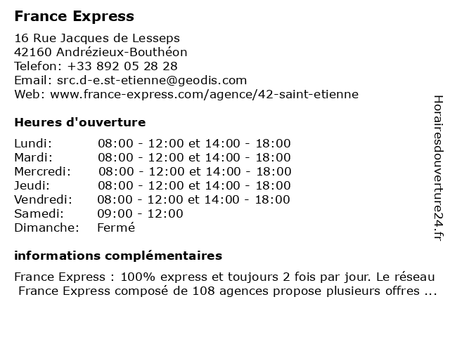 1 France Express (Distance: 11,50 km) 4 Rue Denise Bastide, 42005 Saint Etienne express, france, poste, services, transporteur 2 GEODIS | Distribution & Express - Agence de Saint-Etienne (Andrézieux-Bouthéon) (Distance: 0,05 km) Lieu-dit Le Brûlé, 42160 Andrézieux-Bouthéon agence, andrézieux, bouthéon, de, distribution, etienne, express, geodis, saint 3 France Express (Heures limites de dépôt) (Distance: 11,50 km) 4 Rue Denise Bastide, 42005 Saint Etienne de, dépôt, express, france, heures, limites, poste, services, transporteur 4 Réseau Express (Distance: 11,59 km) n/c ZI Bardot, 42000 Saint-Etienne affrètement, colis, express, messagerie, réseau, transports 5 6 U Express (Distance: 12,70 km) 50 Boulevard Normandie Niemen, 42000 Saint-Étienne express, magasin, nourriture, supermarché |