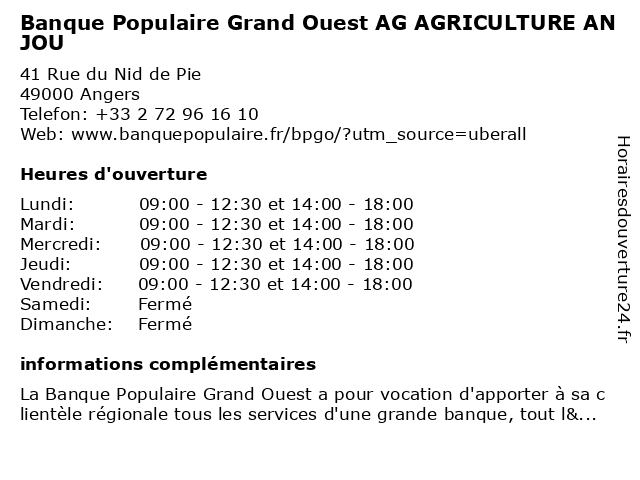 1 Banque Populaire Grand Ouest AGENCE ENTREPRISES ANGERS (Distance: 0,00 km) 41 Rue du Nid de Pie, 49000 Angers agence, angers, banque, entreprises, grand, ouest, populaire 2 Banque Populaire Grand Ouest SIEGE ANGERS NID DE PIE (Distance: 0,00 km) 41 Rue du Nid de Pie, 49000 Angers angers, banque, de, grand, nid, ouest, pie, populaire, siege 3 Banque Populaire Grand Ouest Anjou Banque Privee (Distance: 0,00 km) 41 Rue du Nid de Pie, 49000 Angers anjou, banque, grand, ouest, populaire, privee 4 Anjou Structure (Distance: 0,47 km) 9 rue Joseph Fourier, 49070 Beaucouzé anjou, bureau, béton, ingénierie, structure 5 Clinique Vétérinaire Grand Maine Angers 49 - Chien Chat NAC (Distance: 0,89 km) 12 Place Guy Riobé, 49100 Angers 49, angers, chat, chien, clinique, clinique vétérinaire, grand, maine, nac, vétérinaire 6 Banque Populaire Grand Ouest Angers Grand Maine (Distance: 1,25 km) 2 Allée du Grand Launay, 49000 Angers angers, banque, grand, maine, ouest, populaire |