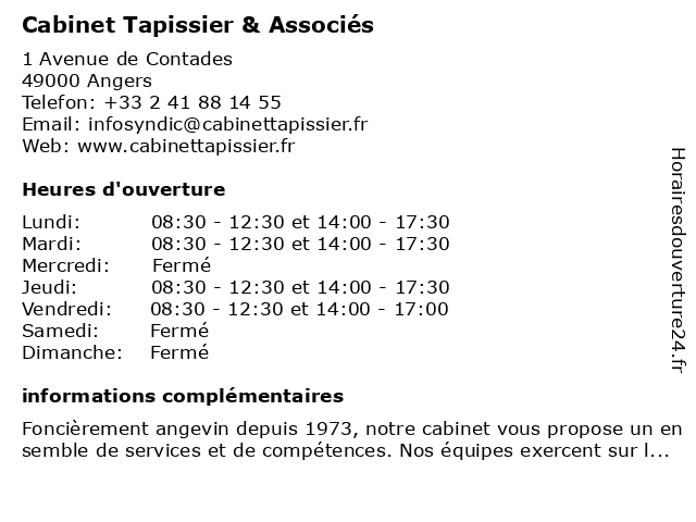 1 Cabinet Tapissier & Associés (Distance: 0,88 km) 31 Rue Saint-Laud, 49100 Angers associés, cabinet, tapissier 2 Cabinet Algologie Hydraform (Distance: 0,09 km) 21 rue du Petit Thouars, 49000 Angers algologie, cabinet, hydraform, instituts de beauté, thalassothérapie 3 DCB Notaires Associés (Distance: 0,14 km) 21 Place La Fayette, 49000 Angers associés, dcb, etude, huissier, justice, maitre, notaires 4 Cabinet Chaillot (Distance: 0,24 km) 2 square La Fayette, 49000 Angers cabinet, chaillot, conseil, industrielle, propriété 5 Cabinet d'Expertises Fralin Isabelle CEFI (Distance: 0,36 km) 2 Square Fayette, 49000 Angers cabinet, cefi, d'expertises, fralin, isabelle 6 Rossignol & Associés (Distance: 0,41 km) 6 Rue Rabelais, 49000 Angers associés, audit, conseil, expertise comptable, fiscalité, juridique, paie, rossignol, social |