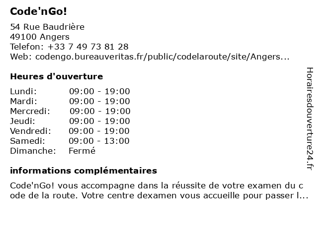 1 ObjectifCode - Centre d'examen du code de la route Angers (Distance: 0,09 km) 10 Place De La République, 49100 Angers angers, centre, code, d'examen, de, du, la, objectifcode, route 2 Fashion Code 49 (Distance: 0,50 km) 10 Rue Saint Etienne, 49100 Angers 49, accessoires, afrique, asie, code, divers, europe, fashion, habillement, magasins, service 3 ObjectifCode - Centre d'examen du code de la route Angers (Distance: 0,53 km) 7 Place Grégoire Bordillon, 49000 ANGERS angers, centre, code, d'examen, de, du, la, objectifcode, route 4 ObjectifCode - Centre d'examen du code de la route Angers (Distance: 1,50 km) 51 Rue Albéric Dubois, 49000 Angers angers, centre, code, d'examen, de, du, la, objectifcode, route 5 ObjectifCode - Centre d'examen du code de la route Angers (Distance: 3,00 km) 264 Rue Du Dr Guichard, 49000 Angers angers, centre, code, d'examen, de, du, la, objectifcode, route 6 Centre d’examen du code de la route - DEKRA (Distance: 3,62 km) 102 Avenue Victor Chatenay, 49100 ANGERS centre, code, cours, de, dekra, du, d’examen, examens, formation, la, permis, route |