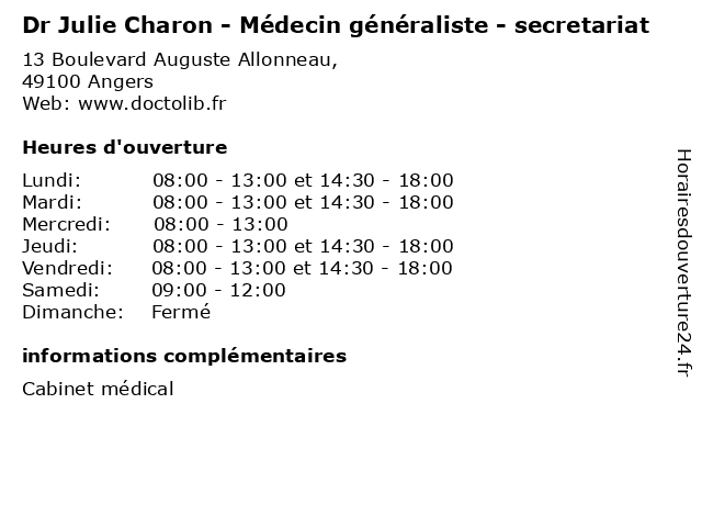 1 Dr Julie Charron - Médecin généraliste (Distance: 0,01 km) 13 Boulevard Auguste Allonneau, 49100 Angers charron, docteur, dr, generaliste, généraliste, julie, medical, médecin, soin 2 Julie Keyser - Sage-femme (Distance: 2,15 km) 4 Rue Larrey, 49933 Angers consultation, docteur, femme, julie, keyser, med, médecin, médecine, sage, traitement 3 Julie Lourdault - Sage-femme (Distance: 2,15 km) 4 Rue Larrey, 49933 Angers consultation, docteur, femme, julie, lourdault, med, médecin, médecine, sage, traitement 4 Shiatsu Julie Delanoue (Distance: 2,94 km) 51 Rue Delaage, 49100 Angers delanoue, julie, massages, relaxation, santé, shiatsu, thérapies 5 Dr Julie Cheignon - Pédiatre (Distance: 3,29 km) 6 Rue de Bellinière, 49800 Trélazé cheignon, dr, enfant, julie, pediatre, pédiatre, sante, soins 6 Wahbi Chadly - Ostéopathe - secretariat (Distance: 3,55 km) 30 Place des Justices, 49000 Angers chadly, chaldy, médecin, médecine, médical, ostéopathe, pharmaceutique, secretariat, traitement, wahbi |