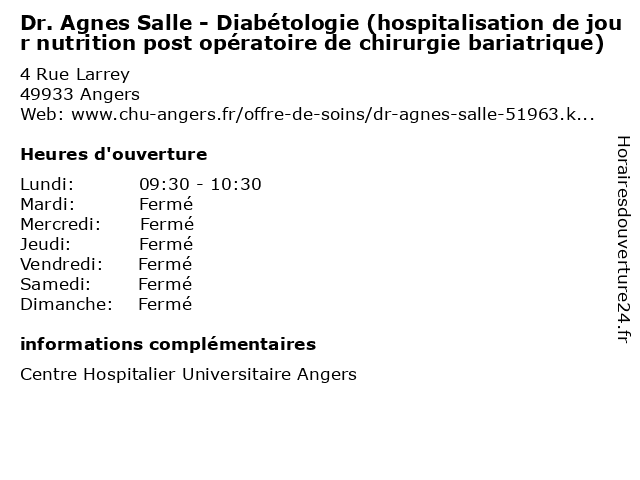 1 Dr. Agnes Salle - Diabétologie (Hospitalisation de jour de nutrition pluridisciplinaire ) (Distance: 0,00 km) 4 Rue Larrey, 49933 Angers agnes, de, diabétologie, docteur, dr., hospitalisation, jour, medecins, nutrition, pluridisciplinaire, salle, sante 2 Dr. Philippe Gohier - Ophtalmologie (bloc opératoire ) (Distance: 0,00 km) 4 Rue Larrey, 49933 Angers bloc, docteur, dr., gohier, medecins, ophtalmologie, opératoire, philippe, sante 3 Dr. Agnes Salle - Diabétologie (hospitalisations de jour suivi post chirurgie bariatrique) (Distance: 0,00 km) 4 Rue Larrey, 49933 Angers agnes, bariatrique, chirurgie, de, diabétologie, docteur, dr., hospitalisations, jour, medecins, post, salle, sante, suivi 4 Dr. Agnes Guichet - Culture cellulaire (Distance: 0,00 km) 4 Rue Larrey, 49933 Angers agnes, cellulaire, culture, docteur, dr., guichet, medecins, sante 5 Jour & Nuit Lingerie (Distance: 1,18 km) 78 Rue Plantagenêt, 49100 Angers bas, boxer, corset, culotte, jour, lingerie, nuisette, nuit, tanga 6 Plateforme d'accompagnement et de répit - Accueil de Jour (Distance: 2,60 km) 15 rue César-Geoffray, 49000 Angers accueil, administration, aidants, angers, d'accompagnement, de, et, jour, les, organismes, personnes, plateforme, pour, publics, répit, services, âgées |