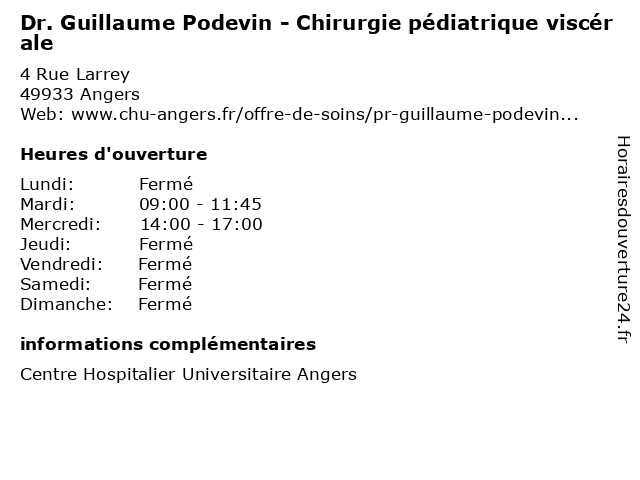 1 Dr. Guillaume Podevin - Chirurgie pédiatrique (Distance: 0,00 km) 4 Rue Larrey, 49933 Angers chirurgie, docteur, dr., guillaume, medecins, podevin, pr., pédiatrique, sante 2 Pr Guillaume Legendre - Gynécologue obstétricien (Distance: 0,00 km) 4 Rue Larrey, 49100 Angers bebe, guillaume, gynecologie, gynécologue, legendre, maternite, obstetrique, obstétricien, pr 3 Guillaume Normand - Ostéopathe (Distance: 1,64 km) 6 Rue du Comte de Tourville, 49100 Angers guillaume, normand, ostéo, ostéopathe, ostéopathes, soins 4 Dr Guillaume Beltran - Radiologue (Distance: 4,04 km) 140 Avenue de Lattre de Tassigny, 49000 Angers beltran, consultation, docteur, dr, guillaume, med, médecin, médecine, radiologue, traitement 5 Dr.Guillaume Bagory - Gynécologue Obstétricien (Distance: 4,04 km) 140 Avenue De Lattre De Tassigny, 49000 Angers bagory, consultation, docteur, dr.guillaume, gynécologue, obstétricien, santé 6 Dr.Guillaume Bagory - Gynécologue Obstétricien (Consultation libre) (Distance: 4,04 km) 140 Avenue De Lattre De Tassigny, 49000 Angers bagory, consultation, docteur, dr.guillaume, gynécologue, libre, obstétricien, santé |
