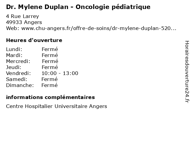 1 Dr. Mylene Duplan - Oncologie pédiatrique (Distance: 0,00 km) 4 Rue Larrey, 49933 Angers docteur, dr., duplan, medecins, mylene, oncologie, pédiatrique, sante 2 Dr. Mylene Duplan - Hématologie pédiatrique (Distance: 0,00 km) 4 Rue Larrey, 49933 Angers docteur, dr., duplan, hématologie, medecins, mylene, pédiatrique, sante 3 Dr. Mylene Duplan - Hématologie pédiatrique (Distance: 0,00 km) 4 Rue Larrey, 49933 Angers docteur, dr., duplan, hématologie, medecins, mylene, pédiatrique, sante 4 Dr. Emilie Eyssartier - Chirurgie pédiatrique (Distance: 0,00 km) 4 Rue Larrey, 49933 Angers chirurgie, docteur, dr., emilie, eyssartier, medecins, pédiatrique, sante 5 Dr. Samantha Roux-Vaillard - Chirurgie pédiatrique (Distance: 0,00 km) 4 Rue Larrey, 49933 Angers chirurgie, docteur, dr., medecins, pédiatrique, roux, samantha, sante, vaillard 6 Dr. Francoise Schmitt - Chirurgie pédiatrique (Distance: 0,00 km) 4 Rue Larrey, 49933 Angers chirurgie, docteur, dr., francoise, medecins, pédiatrique, sante, schmitt |