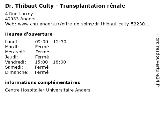 1 Dr. Thibaut Culty - Urologie (Distance: 0,00 km) 4 Rue Larrey, 49933 Angers culty, docteur, dr., medecins, sante, thibaut, urologie 2 Dr. Agnes Duveau - Transplantation rénale (Suivi de transplantation) (Distance: 0,00 km) 4 Rue Larrey, 49933 Angers agnes, de, docteur, dr., duveau, medecins, rénale, sante, suivi, transplantation 3 Thibaut Chauvin - Ostéopathe (Distance: 3,51 km) 49000 Rue du Bois l'Abbé, 49000 Écouflant chauvin, ostéo, ostéopathe, ostéopathes, soins, thibaut 4 Dr Thibaut Py - Médecin généraliste (Distance: 5,57 km) 1 Rue du Petit Vivier, 49080 Bouchemaine docteur, dr, generaliste, généraliste, medical, médecin, py, soin, thibaut 5 Dr. Godichon Thibaut - Ostéopathe (Distance: 11,22 km) 4 Rue de la Vieille, 49112 Pellouailles-les-Vignes docteur, dr., godichon, medecins, ostéopathe, sante, thibaut 6 Dr Roseline Atsama-Ondoa - Néphrologue (Distance: 0,40 km) 5 Rue André Boquel, 49000 Angers atsama, dr, insuffisance, nephrologie, nephrologue, néphrologue, ondoa, roseline, rénale |