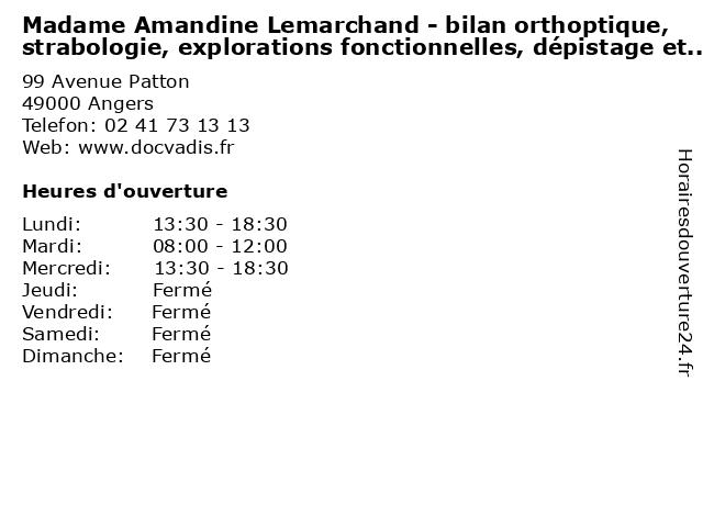 1 Madame Amandine Lemarchand - bilan orthoptique, strabologie, explorations fonctionnelles, dépistage et suivi des défauts visuels de l'adulte et de l'enfant (Consultation sur rendez-vous) (Distance: 0,00 km) 99 Avenue Patton, 49000 Angers amandine, bilan, consultation, de, des, docteur, défauts, dépistage, et, explorations, fonctionnelles, l'adulte, l'enfant, lemarchand, madame, orthoptique, rendez, strabologie, suivi, sur, visuels, vous 2 Centre de Dépistage Covid-19 Angers (Distance: 2,79 km) 7 Rue Chaussée Saint Pierre, 49100 Angers 19, angers, centre, centre covid, centre de dépistage, coronavirus, covid, covid19, de, dépistage, laboratoire, laboratoire d analyse médicale, résultats, sérologie, test covid, test pcr 3 Dr. Nicole Meslier - Explorations fonctionnelles respiratoires (Distance: 2,80 km) 4 Rue Larrey, 49933 Angers docteur, dr., explorations, fonctionnelles, medecins, meslier, nicole, respiratoires, sante 4 Dr. Nicole Meslier - Explorations fonctionnelle du sommeil (Distance: 2,80 km) 4 Rue Larrey, 49933 Angers docteur, dr., du, explorations, fonctionnelle, medecins, meslier, nicole, sante, sommeil 5 Dr. Pascaline Priou - Explorations fonctionnelle du sommeil (Distance: 2,80 km) 4 Rue Larrey, 49933 Angers docteur, dr., du, explorations, fonctionnelle, medecins, pascaline, priou, sante, sommeil 6 Dr. Vivien Pautot - Explorations neuro-musculaires (Distance: 2,80 km) 4 Rue Larrey, 49933 Angers docteur, dr., explorations, medecins, musculaires, neuro, pautot, sante, vivien |