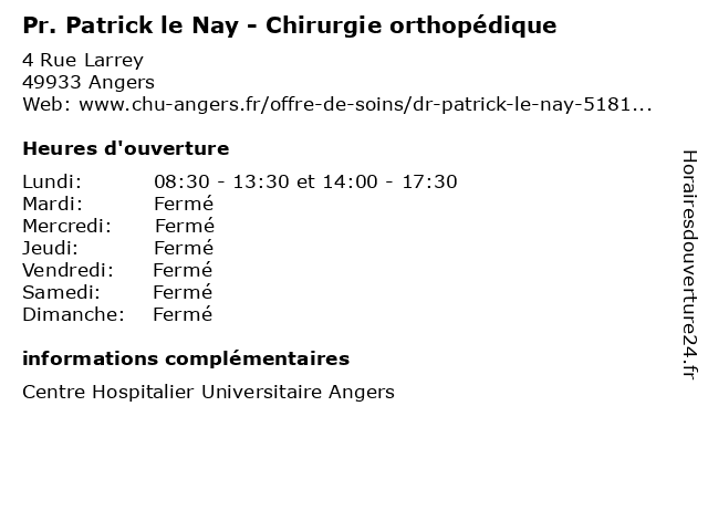 Termes de recherche pour Pr. Patrick le Nay - Chirurgie orthopédique:le, patrick, santé, nay, chirurgie, docteur, médecins, orthopédique, pr. |