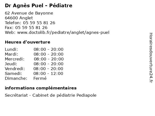 1 Dr Agnès Puel - Pédiatre (Distance: 2,15 km) 13 Avenue de l'Interne Jacques Loeb, 64100 Bayonne agnès, consultation, docteur, dr, med, médecin, médecine, puel, pédiatre, traitement 2 Dr Sabrina Dubois-Zuazo - Pédiatre (Distance: 0,00 km) 62 Avenue de Bayonne, 64600 Anglet consultation, docteur, dr, dubois, med, médecin, médecine, pédiatre, sabrina, traitement, zuazo 3 Dr Virginie Feret - Pédiatre (Distance: 0,00 km) 62 Avenue de Bayonne, 64600 Anglet consultation, docteur, dr, feret, med, médecin, médecine, pédiatre, traitement, virginie 4 Dr Sylvie Laporte - Pédiatre (Distance: 0,00 km) 62 Avenue de Bayonne, 64600 Anglet consultation, docteur, dr, laporte, med, médecin, médecine, pédiatre, sylvie, traitement 5 Agnès Tristant - Hypnothérapeute (Distance: 1,70 km) 5 Allée de la Licorne, 64600 Anglet agnès, hypnose, hypnotherapeute, hypnothérapeute, sante, soins, tristant 6 Maître Agnès Garms - Avocate (Distance: 2,09 km) 1 avenue de Marhum, 64100 Bayonne agnès, avocate, avocats, civils, droits, garms, juridiques, maître |