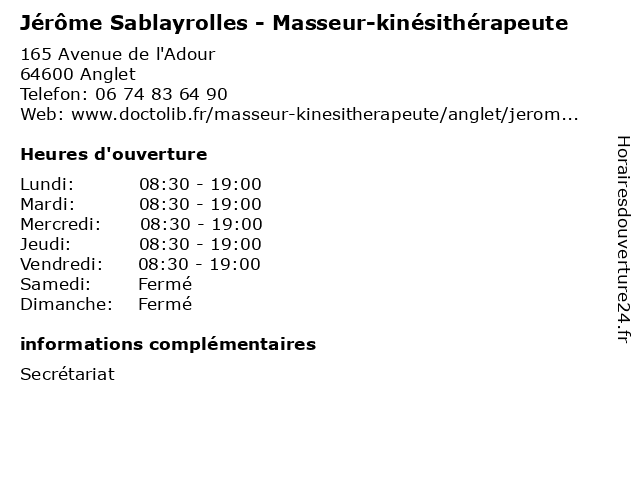 2 Boucherie Chez Jérôme (Distance: 3,73 km) 30 Rue Sainte-Catherine, 64100 Bayonne boucherie, chez, jérôme 3 Dr Jérôme Murgier - Chirurgien orthopédiste et trau (Distance: 3,92 km) 6 Chemin de la Marouette, 64100 Bayonne chirurgien, dr, et, jérôme, murgier, orthopedie, orthopédique, orthopédiste, trau, trauma, traumatologie, traumatologique 4 Dr Jérôme Pillot - Anesthésiste (Distance: 4,32 km) 13 avenue de l'Interne Jacques Loëb, 64100 Bayonne anesthésiste, consultation, docteur, dr, jerome, jérôme, med, médecin, médecine, pillot, traitement 5 Dr Jérôme Murgier - Chirurgien du Genou (Distance: 4,68 km) 21 Rue de l'Estagnas, 64200 Biarritz chirurgie, chirurgien, dr, du, genou, jérôme, murgier, prothèse, sport 6 Dr Jérôme Ribiere - Chirurgien plasticien et esthétique (Distance: 5,25 km) 79 Avenue de la Marne, 64200 Biarritz chirurgie, chirurgien, consultation, docteur, dr, esthétique, et, jérome, jérôme, plasticien, ribiere, santé |