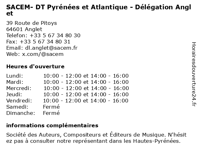 Termes de recherche pour SACEM- DT Pyrénées et Atlantique - Délégation Anglet:et, anglet, pyrenees, atlantique, dt, délégation, sacem |