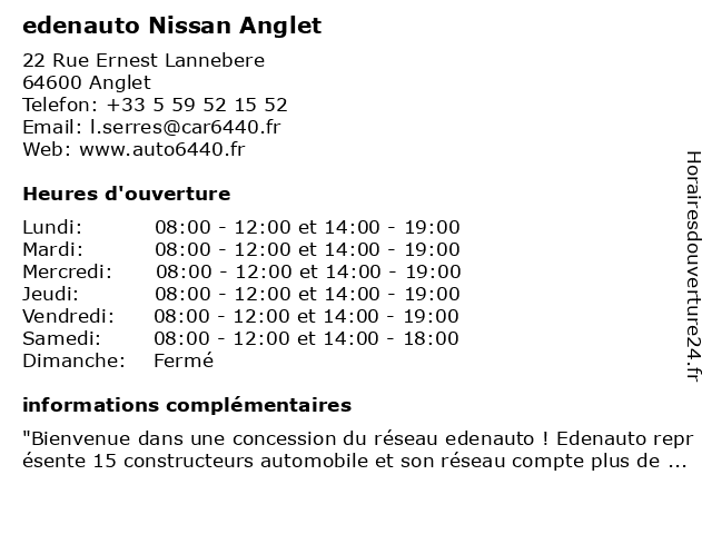 2 Nissan - Auto6440 - Vente (Distance: 0,03 km) 22bis Rue Ernest Lannebere, 64600 Anglet atelier, auto6440, automobile, concessionnaire, garage, neuve, nissan, occasion, réparation, vente 3 Edenauto Renault Bayonne - Atelier (Distance: 0,74 km) 59 Allées Marines, 64100 Bayonne atelier, automobile, bayonne, concessionnaire, edenauto, garage, neuve, occasion, renault, réparation, vente 4 Edenauto Renault - Atelier (Distance: 4,73 km) 5 allée Marie Politzer, 64200 Biarritz atelier, automobile, concessionnaire, edenauto, garage, neuve, occasion, renault, réparation, vente 5 Edenauto Renault - Commercial (Distance: 4,73 km) 5 Allée Marie Politzer, 64200 Biarritz biarritz, commercial, dacia occasion, edenauto, neuve, renault, renault neuve, renault occasion, voitre neuve, voiture occasion 6 Edenauto - Renault - Commercial (Distance: 13,51 km) . Route Départementale 932, 64480 Larressore atelier, automobile, commercial, concessionnaire, edenauto, garage, neuve, occasion, renault, réparation, vente |