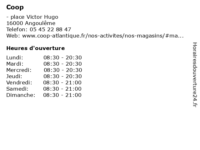 1 Coop (Distance: 1,44 km) 12 Rue des Postes, 16000 Angoulême alimentation, boisson, coop, fruits, légumes, superette, épicerie 2 Coop (Distance: 2,38 km) 95 rue de Saintes, 16000 Angoulême alimentation, coop, fruits, légumes, market, épicerie 3 Coop (Distance: 2,39 km) 139 route de Paris, 16160 Gond-Pontouvre atlantique, coop, epiceries, supérette 4 Coop (Distance: 5,01 km) 31 avenue de la République, 16470 Saint-Michel alimentation, boisson, charcuterie, coop, supermarché, épicerie 5 Coop (Distance: 11,36 km) - Place du Champ de Foire, 16440 Mouthiers-sur-Boëme atlantique, coop, epiceries, supérette 6 Coop (Distance: 12,81 km) - Zone du Champs de Foire, 16330 Vars alimentation, boisson, charcuterie, coop, supermarché, épicerie |