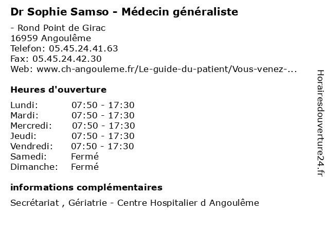 1 Dr Sophie Bouriez - Médecin généraliste (Distance: 0,67 km) - Rond-Point de Girac, 16000 Angoulême bouriez, consultation, docteur, dr, généraliste, med, médecin, sophie, traitement 2 AGENCE GESSON SOPHIE ELIAT ARCHITECTES (Distance: 2,12 km) 15 Boulevard Poitou Charentes, 16000 Angoulême agence, architectes, eliat, gesson, sophie 4 Style by Sophie (Distance: 3,24 km) 8 Boulevard de Bretagne, 16000 Angoulême beauté, by, coiffeur, coiffure, enfant, femme, homme, mixte, salon, sophie, style 6 Bernard-Chabrier Sophie (Distance: 3,73 km) 23 Rue de Lavalette, 16000 Angoulême bernard, chabrier, sophie |