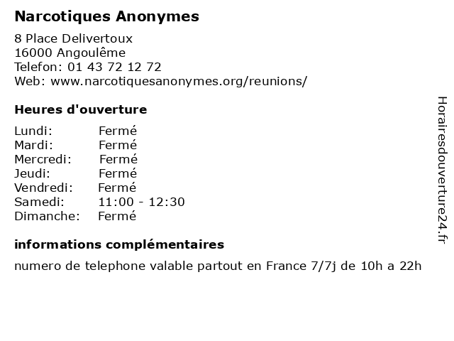 1 Alcooliques Anonymes (Ouverte à tout public - fermeture non définie) (Distance: 2,88 km) - Place Vitoria, 16000 Angoulême alcooliques, anonymes, définie, fermeture, non, ouverte, public, réunion, tout 2 Alcooliques Anonymes (Réunion ouverte - fermeture non définie) (Distance: 2,88 km) - Place Vitoria, 16000 Angoulême alcooliques, anonymes, définie, fermeture, non, ouverte, réunion 3 Alcooliques Anonymes (Réunion fermée - fermeture non définie) (Distance: 2,88 km) - Place Vitoria, 16000 Angoulême alcooliques, anonymes, définie, fermeture, fermée, non, réunion 4 Alcooliques Anonymes (Réunion fermée - fermeture non définie) (Distance: 38,18 km) 14 Rue P Pinard, 16100 Châteaubernard alcooliques, anonymes, définie, fermeture, fermée, non, réunion 5 Alcooliques Anonymes (Réunion ouverte - fermeture non définie) (Distance: 38,18 km) 14 Rue P Pinard, 16100 Châteaubernard alcooliques, anonymes, définie, fermeture, non, ouverte, réunion 6 Association D'Entraide Multiple (Distance: 56,39 km) 19 Rue Charles de Gaulle, 17800 Pons association, d'entraide, multiple |