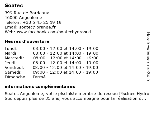 1 Soatec - été (Distance: 0,01 km) 399 Rue de Bordeaux, 16000 Angoulême construction, equipement, ete, fabrication, matériaux, piscines, soatec, été |