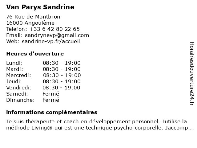 1 Maître Sandrine Le Roux - Avocate (Distance: 2,92 km) 11 Boulevard de Bretagne, 16000 Angouleme avocat, avocate, droit, juridictionnelle, le, maître, négociation, roux, sandrine 2 Blacksheep Van (Distance: 3,33 km) - Parc de la Rocade, 16600 Ruelle-sur-Touvre aménager, blacksheep, location, séjours, tourisme, vacances, van, vans 3 Dr Sandrine Paradot - Médecin généraliste (Distance: 4,77 km) - Rond Point de Girac, 16959 Angoulême consultation, docteur, dr, généraliste, med, médecin, médecine, paradot, sandrine, traitement 4 M. Laurent Sandrine (Distance: 9,49 km) 8 Route des Sept Journaux, 16430 Vindelle laurent, m., sandrine 5 Ribot Vanessa Sandrine (Distance: 20,21 km) 1 Impasse Du Courage, 16170 Genac restaurants, ribot, sandrine, vanessa 6 Dr Sandrine Avenel - Pédiatre (Distance: 37,06 km) 71 Avenue d’Angouleme,, 16100 Châteaubernard avenel, dr, enfant, pediatre, pédiatre, sandrine, sante, soins |