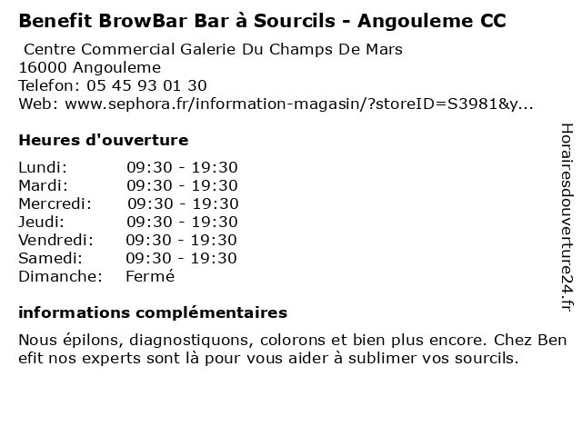 Termes de recherche pour Benefit BrowBar Bar à Sourcils - Angouleme CC:bar, cc, salon de beauté, angouleme, benefit, sourcils, magasin de produits cosmétiques, browbar |
