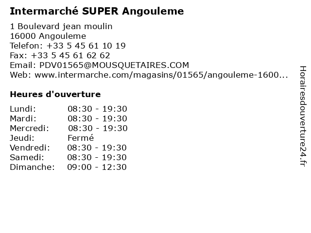 1 Intermarché SUPER Angouleme (Distance: 2,40 km) 145 Rue saint roch, 16000 Angouleme angouleme, intermarché, super 2 Intermarché station-service Angouleme (Distance: 0,06 km) 1 Boulevard Jean Moulin, 16000 Angoulême angouleme, intermarché, service, station 3 Intermarché station-service Angouleme (Distance: 0,07 km) 1 Boulevard jean moulin, 16000 Angouleme angouleme, intermarché, service, station 4 Intermarché / Car park (Distance: 2,07 km) n/a Rue Saint-Roch, 16000 Angouleme automobile, car, effia, intermarché, park, parking, services 5 Intermarché / Car park (Distance: 2,43 km) n/a Rue de Saintes, 16000 Angouleme automobile, car, effia, intermarché, park, parking, services 6 Carrefour Proxi Super (Distance: 3,09 km) 49 rue maurice Ravel, 16800 Soyaux alimentaire, alimentation, carrefour, city, courses, distributeur, hypermarché, proxi, super, supermarché, épicerie |
