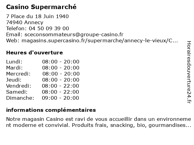 1 Casino Supermarché (Distance: 1,11 km) 50 Avenue du Parmelan, 74000 Annecy alimentation, boisson, casino, supermarché, épicerie 2 Casino Supermarché (Distance: 3,18 km) 21 Avenue de la République, 74960 Cran-Gévrier alimentation, boisson, casino, supermarché, épicerie 3 Casino Supermarché (Distance: 9,49 km) - place du docteur Dubois, 74330 La Balme-de-Sillingy alimentation, casino, fruits, légumes, supermarché, épicerie 4 Vival By Casino (Distance: 0,60 km) 11 Rue de Lachat, 74940 Annecy-le-Vieux alimentation, by, casino, distributeur alimentaire, supermarché, supérette, vival, épicerie 5 Le Petit Casino (Distance: 0,98 km) 1 rue Centrale, 74940 Annecy-le-Vieux alimentation, casino, fruits, le, légumes, petit, superette, épicerie 6 Vival by Casino (Distance: 0,99 km) 2 Rue Georges Martin, 74000 Annecy by, casino, droguerie, d’hypermarchés, frais, fruits et légumes, hygiène, parfumerie et autres produits non alimentaires., surgelés, vival, épicerie  |