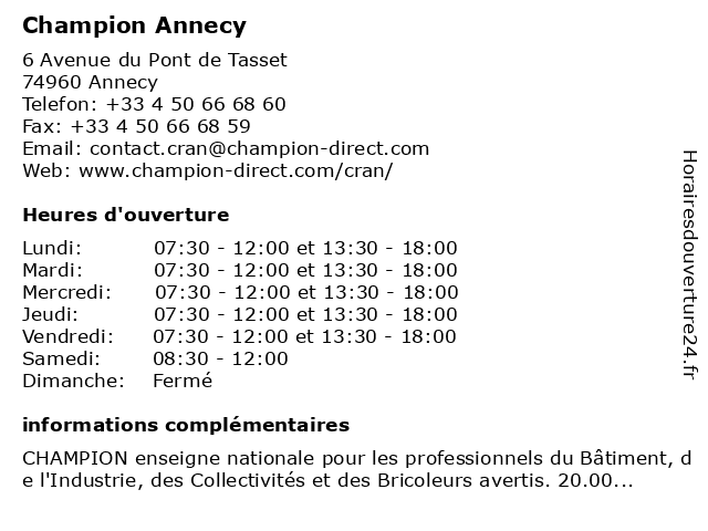 | Lundi | 07:30-12:00 et 13:30-18:00 |