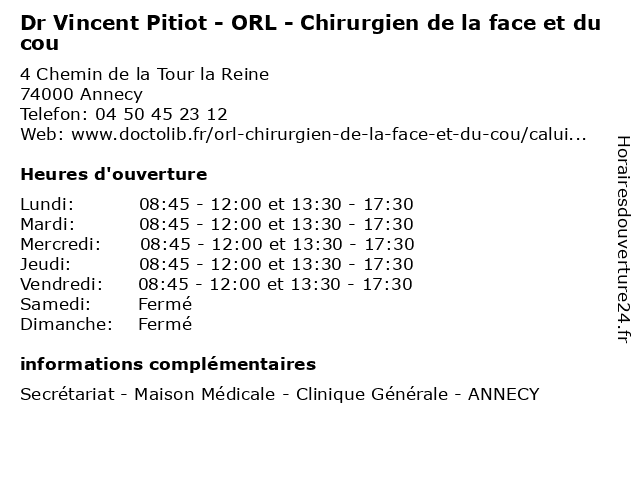 1 Dr Christophe Bodino - ORL - Chirurgien de la face et du cou (Distance: 0,00 km) 4 Chemin de la Tour la Reine, 74000 Annecy bodino, chirurgien, christophe, consultation, cou, de, docteur, dr, du, et, face, la, med, médecin, médecine, orl, secrétariat, traitement 2 Dr Vincent Pitiot - ORL (Distance: 0,04 km) 4 Chemin de la Tour la Reine, 74000 Annecy dr, laryngologiste, médecin, médecine, médical, orl, oto, pharmaceutique, pitiot, rhino, secretariat, traitement, vincent 3 Dr Vincent Pitiot - ORL (Distance: 0,04 km) 4 Chemin de la Tour la Reine, 74000 Annecy dr, laryngologiste, médecin, médecine, médical, orl, oto, pharmaceutique, pitiot, rhino, secretariat, traitement, vincent 4 Clinique Générale - Chirurgie ORL & Cervico-faciale (Distance: 0,11 km) 4 Chemin de la Tour la Reine, 74000 Annecy bureau, cervico, chirurgie, clinique, consultation, dr, faciale, générale, maladie, med, médecin, médecine, orl, pratique, thérapie, traitement 5 Dr Jacques Leblond - ORL - Chirurgien de la face et du cou - secrétariat (Distance: 4,38 km) - Allée de la Mandallaz, 74370 Metz-Tessy chirurgien, consultation, cou, de, docteur, dr, du, et, face, jacques, la, leblond, med, médecin, médecine, orl, secrétariat, traitement 6 Dr Philippe Million - ORL - Chirurgien de la face et du cou - secrétariat (Distance: 4,38 km) - Allée de la Mandallaz, 74370 Metz-Tessy chirurgien, consultation, cou, de, docteur, dr, du, et, face, la, med, million, médecin, médecine, orl, philippe, secrétariat, traitement |
