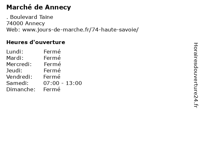 1 Marché de Annecy (Distance: 0,06 km) . Rue Félix Petit, 74000 Annecy annecy, de, frutas, hortalizas, marché, mercado, verduras 2 Marché de Annecy (Distance: 0,26 km) . Novel, 74000 Annecy annecy, de, frutas, hortalizas, marché, mercado, verduras 3 Marché de Annecy (Distance: 0,92 km) . Ville, 74000 Annecy annecy, de, frutas, hortalizas, marché, mercado, verduras 4 Marché de Annecy (Distance: 0,96 km) . Quai de l'Evêché, 74000 Annecy annecy, de, frutas, hortalizas, marché, mercado, verduras 5 Marché de Annecy (Distance: 1,36 km) . Place de la Mandallaz, 74000 Annecy annecy, de, frutas, hortalizas, marché, mercado, verduras 6 Marché à Annecy (Distance: 0,52 km) . Place des Romains, 74000 Annecy annecy, frutas, hortalizas, marché, mercado, modane, verduras |