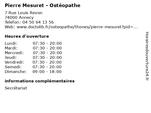 | Samedi | 07:30-20:00 |