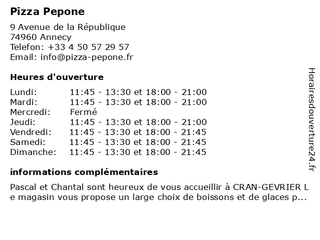 3 Pizza Pepone (Distance: 3,25 km) 11 rue du Lachat, 74940 Annecy-le-Vieux pasta, pepone, pizza, pizzas, pizzeria, restaurant, salades 4 Pizza Le Prado (Distance: 0,65 km) 39 Rue de la Crête, 74960 Cran Gevrier le, pizza, pizzas, pizzeria, prado, restaurant, restauration 6 Royal Pizza (Distance: 0,96 km) 13 Avenue de la Mandallaz, 74000 Annecy pizza, pizzas, pizzeria, restaurant, restauration, royal |
