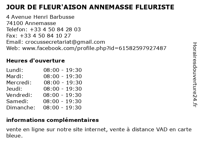 | Lundi | 08:00-19:30 |
