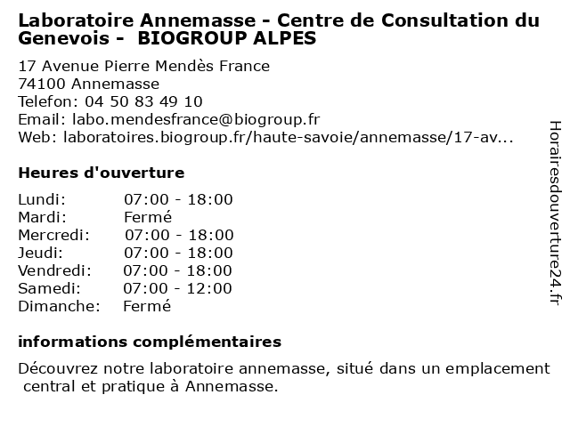 1 Centre Ophtalmologie Genevois (Distance: 0,08 km) 17 Avenue Pierre Mendès France, 74100 Annemasse annemasse, cataracte, centre, genevois, intervention, ophtalmologie, traitement 2 Laboratoire de biologie médicale Oriade Noviale (Distance: 0,10 km) 17 Avenue Pierre Mendès France, 74100 Annemasse biologie, de, laboratoire, médicale, noviale, oriade 4 Audition Conseil Laboratoire Thevenin (Distance: 1,01 km) 2 Rue Alfred Bastin, 74100 Annemasse audition, conseil, laboratoire, thevenin 5 Laboratoire de biologie médicale Oriade Noviale (Distance: 1,01 km) 2 Rue Alfred Bastin, 74100 Annemasse biologie, de, laboratoire, médicale, noviale, oriade 6 Laboratoire de Gaillard - BIOGROUP ALPES (Distance: 1,11 km) 118 Rue De Genève, 74240 Gaillard alpes, biogroup, de, dépistages, gaillard, laboratoire, laboratoire de diagnostic |