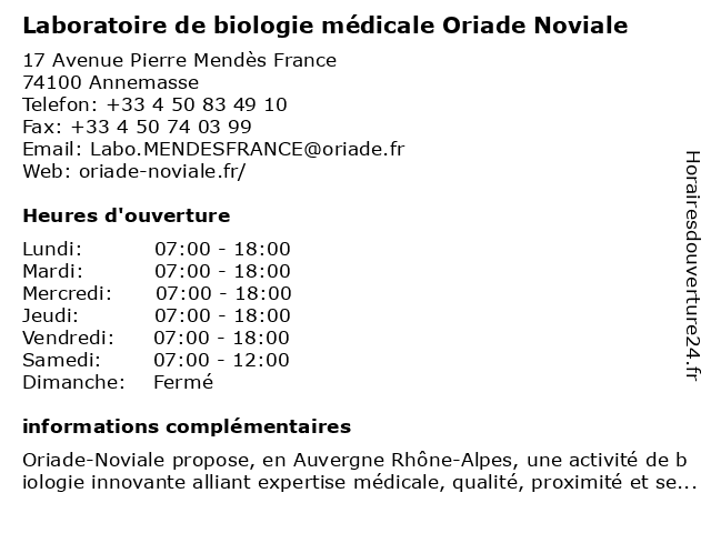 1 Laboratoire de biologie médicale Oriade Noviale (Distance: 0,97 km) 2 Rue Alfred Bastin, 74100 Annemasse biologie, de, laboratoire, médicale, noviale, oriade 2 Laboratoire de biologie médicale Oriade Noviale (Distance: 1,54 km) 15 Rue du Môle, 74100 Annemasse biologie, de, laboratoire, médicale, noviale, oriade 3 Laboratoire de biologie médicale Oriade Noviale (Distance: 10,24 km) 37 Route du Chef Lieu, 74250 Fillinges biologie, de, laboratoire, médicale, noviale, oriade 4 Laboratoire Annemasse - Centre de Consultation du Genevois - BIOGROUP ALPES (Distance: 0,10 km) 17 Avenue Pierre Mendès France, 74100 Annemasse alpes, annemasse, biogroup, centre, consultation, de, du, dépistages, genevois, laboratoire, laboratoire de diagnostic 5 Audition Conseil Laboratoire Thevenin (Distance: 0,97 km) 2 Rue Alfred Bastin, 74100 Annemasse audition, conseil, laboratoire, thevenin 6 Laboratoire de Gaillard - BIOGROUP ALPES (Distance: 1,21 km) 118 Rue De Genève, 74240 Gaillard alpes, biogroup, de, dépistages, gaillard, laboratoire, laboratoire de diagnostic |