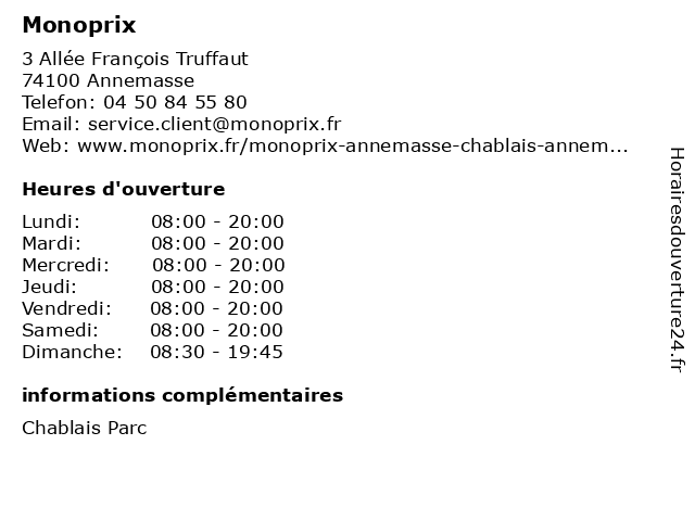 1 Monoprix (Distance: 0,37 km) 10 Rue de la Gare, 74100 Annemasse alimentaire, alimentation, courses, monoprix, supermarché, supérette, épicerie 2 Monoprix (Distance: 26,88 km) 3 Rue des Arts, 74200 Thonon-les-Bains alimentation, distributeur, monoprix, shopping, supermarché, épicerie 3 Monoprix (Distance: 33,68 km) 65 Rue Carnot, 74000 Annecy alimentation, epiceries, fruits, légumes, monoprix 4 Monoprix (Distance: 34,52 km) - rue du Collège, 74000 Annecy alimentaire, alimentation, courses, monoprix, supermarché, supérette, épicerie 5 Monoprix (Distance: 35,22 km) - Rue du Lac, 74500 Evian Les Bains alimentaire, alimentation, courses, monoprix, supermarché, supérette, épicerie 6 Monoprix (Distance: 42,16 km) 41 Avenue de la Gare, 74700 Sallanches alimentation, distributeur, monoprix, shopping, supermarché, épicerie |