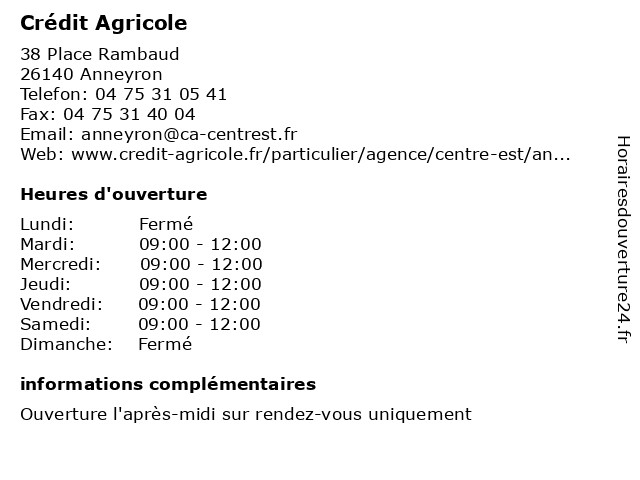 1 Crédit Agricole (Distance: 0,09 km) 9 Place Rambaud, 26140 Anneyron agence, agricole, assurance, crédit, finances, immobilier, protection, prêt, santé, véhicule 2 Crédit Agricole (Distance: 6,22 km) 19 Place Gaston Oriol, 26140 Saint-Rambert d'Albon agence, agricole, assurance, bancaire, banque, crédit 3 Crédit Agricole (Distance: 6,83 km) - Le Castel Fleuri, 26330 Châteauneuf-de-Galaure agence, agricole, assurance, bancaire, banque, crédit 4 Crédit Agricole (Distance: 10,35 km) 5 Rue Daniel Balavoine, 38150 Salaise-sur-Sanne agence, agricole, assurance, bancaire, banque, crédit 5 Crédit Agricole (Distance: 10,86 km) - Grande Rue, 26390 Hauterives agence, agricole, assurance, bancaire, banque, crédit 6 Crédit Agricole (Distance: 11,61 km) - Place Aristide Briand, 26240 Saint-Vallier agence, agricole, assurance, bancaire, banque, crédit |