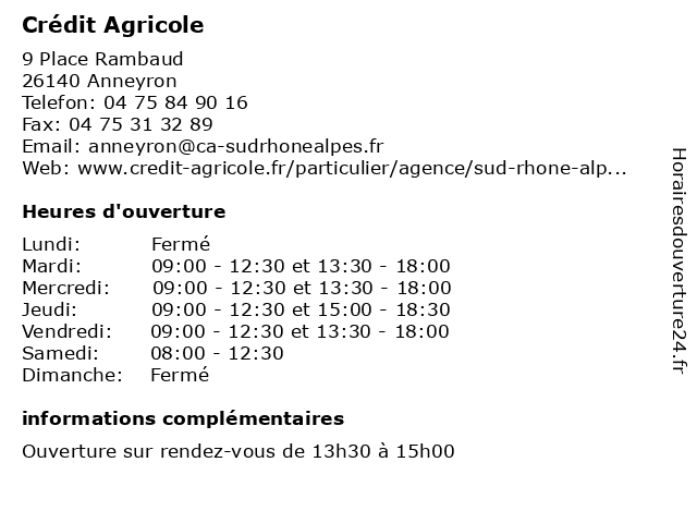 1 Crédit Agricole (Distance: 0,09 km) 38 Place Rambaud, 26140 Anneyron agence, agricole, assurance, bancaire, banque, crédit 2 Crédit Agricole (Distance: 6,13 km) 19 Place Gaston Oriol, 26140 Saint-Rambert d'Albon agence, agricole, assurance, bancaire, banque, crédit 3 Crédit Agricole (Distance: 6,91 km) - Le Castel Fleuri, 26330 Châteauneuf-de-Galaure agence, agricole, assurance, bancaire, banque, crédit 4 Crédit Agricole (Distance: 10,27 km) 5 Rue Daniel Balavoine, 38150 Salaise-sur-Sanne agence, agricole, assurance, bancaire, banque, crédit 5 Crédit Agricole (Distance: 10,95 km) - Grande Rue, 26390 Hauterives agence, agricole, assurance, bancaire, banque, crédit 6 Crédit Agricole (Distance: 11,58 km) - Place Aristide Briand, 26240 Saint-Vallier agence, agricole, assurance, bancaire, banque, crédit |