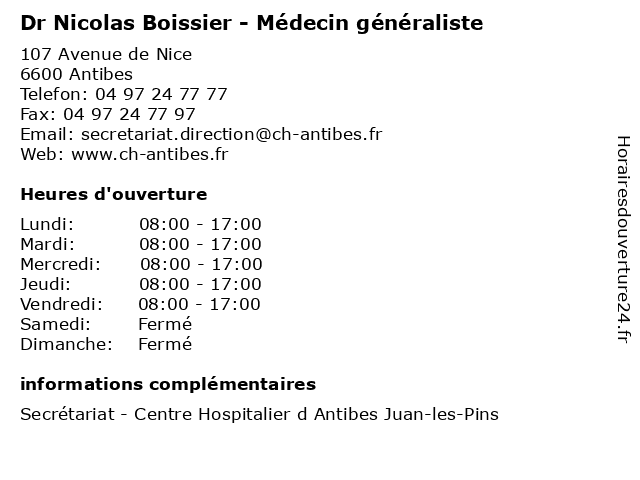 1 Dr Nicolas Cardin - Chirurgien viscéral et digestif (Distance: 0,00 km) 107 Avenue de Nice, 06606 Antibes antibes, cardin, centre, chirurgien, digestif, disgestive, dr, et, foie, glandes, généraliste, hospitalier, juan, les, nicolas, pins, viscerale, viscéral 2 Dr Nicolas Clement - Médecin généraliste (Distance: 0,00 km) 107 Avenue de Nice, 06600 Antibes clement, consultation, docteur, dr, généraliste, med, médecin, nicolas, traitement 3 École maternelle publique Boissier Mat (Distance: 0,39 km) 116 Breguières, 06600 Antibes boissier, cours, mat, maternelle, publique, servicios, école 4 École Maternelle Publique Boissier (Distance: 0,40 km) 116 Chemin des Basses Breguières, 06600 Antibes boissier, cours, education, maternelle, publique, services, école 5 École élémentaire publique Boissier (Distance: 0,40 km) 116 Chemin des Basses Breguières, 06600 Antibes boissier, cours, education, publique, services, école, élémentaire 6 |