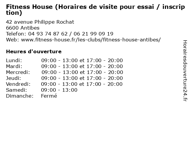 1 Fitness House (Horaires de visite pour essai / inscription) (Distance: 0,49 km) 3 avenue Tourre, 06600 Antibes cardio, de, essai, fitness, gym, horaires, house, inscription, musculation, pour, visite 2 Fitness House (Horaires de visite pour essai / inscription) (Distance: 15,48 km) 45 route d’Opio, 06740 Chateauneuf cardio, de, essai, fitness, gym, horaires, house, inscription, musculation, pour, visite 5 Club House Tennis Club (Distance: 0,62 km) 330 Avenue Jules Grec, 06600 Antibes club, house, restaurants, spagnou, tennis 6 Effia (Horaires d’Accueil) (Distance: 0,75 km) 260 Avenue Jules Grec, 06600 Antibes d’accueil, effia, horaires, parking, services, stationnement |