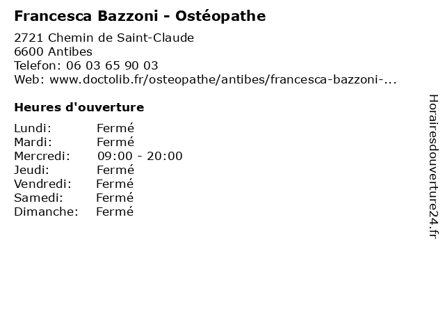 1 Pressing Francesca (Distance: 8,50 km) 5 Rue de l'Eglise, 06800 Cagnes-sur-Mer blanchisserie, cagnes-sur-mer, francesca, pressing 2 Francesca Piancino - Masseur-kinésithérapeute (Distance: 20,77 km) 30 Voie Romaine, 06001 Nice consultation, docteur, dr, francesca, kinésithérapeute, masseur, med, médecin, piancino, traitement 3 L'Instant By Francesca (Distance: 34,01 km) 21 Place dei Tresmast, 83600 Fréjus beauté, by, coiffure, coiffures, coloristes, francesca, l'instant 4 Lucile Aucremanne - Ostéopathe (Distance: 0,03 km) 2721 chemin de Saint-Claude, 06600 Antibes aucremanne, bébé, consultation, docteur, femme enceinte, lucile, manipulation, massage, médecin, nourrisson, ostéopathe, soin, sportif 5 Dmitrii Mironov - Ostéopathe - secretariat (Distance: 0,11 km) 2625 Chemin de Saint-Claude,, 06600 Antibes dmitrii, mironov, médecin, médecine, médical, ostéopathe, pharmaceutique, secretariat, traitement 6 Lauren Cattan - Chiropracteur (Distance: 0,12 km) 126 Rue du Bon Air, 06600 Antibes cattan, chiro, chiropracteur, lauren, sante, soins |