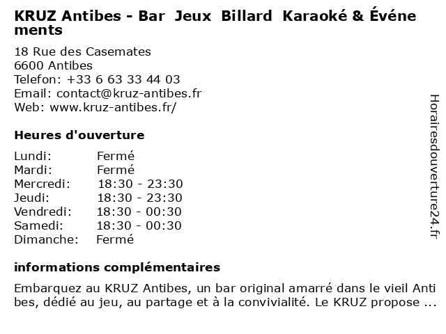 | Samedi | 18:30-00:30 |