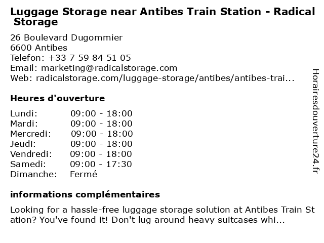 1 Nannybag Luggage Storage (Distance: 0,02 km) 24 Boulevard Dugommier, 06600 Antibes luggage, nannybag, storage 2 Radical Storage - Luggage Storage Antibes Train Station (Distance: 0,06 km) 21 Avenue Robert Soleau, 06600 Antibes antibes, luggage, luggage storage, luggage storage near me, radical, station, storage, train 3 Nannybag Luggage Storage - CLOSED (Distance: 0,14 km) 18 Av. Robert Soleau, 06600 Antibes closed, luggage, nannybag, storage 5 Radical Storage - Luggage Storage Antibes City Center (Distance: 0,17 km) 4 Avenue Tourre, 06600 Antibes antibes, center, city, luggage, luggage storage, luggage storage near me, radical, storage 6 Radical Epil (Distance: 0,26 km) 16 Rue des Frères Olivier, 06600 Antibes centre esthétique, dépilation definitive, epil, epilation, radical |