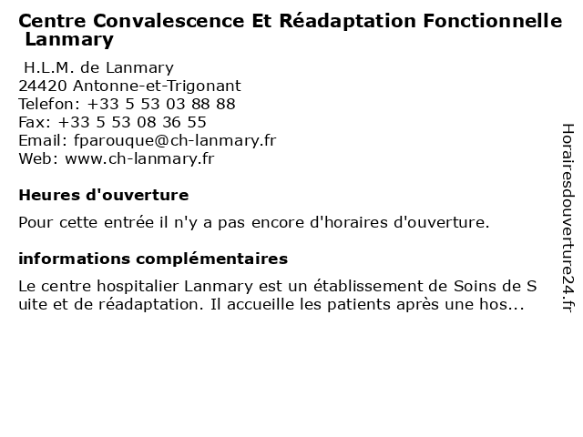 1 Centre Hospitalier Lanmary Antonne Et Trigonant (Distance: 2,15 km) . Lanmary, 24420 Antonne Et Trigonant antonne, centre, docteur, et, hospitalier, lanmary, medecins, sante, trigonant 2 C.H. Lanmary - Médecine générale (secrétariat ) (Distance: 2,15 km) - rue Lanmary, 24420 Antonne Et Trigonant c.h., consultation, docteur, générale, lanmary, médecine, santé, secrétariat 3 Dr Anna Jirot - Spécialiste en médecine physique et de réadaptation (Distance: 8,53 km) 80 Avenue Georges Pompidou, 24000 Périgueux anna, consultation, de, docteur, dr, en, et, jirot, med, médecin, médecine, physique, réadaptation, spécialiste, traitement 4 Dr Julie Peroua Viault - Spécialiste en médecine physique et de réadaptation (Distance: 8,99 km) 26 Rue Paul Louis Courier, 24750 Trélissac consultation, de, docteur, dr, en, et, julie, med, médecin, médecine, peroua, physique, réadaptation, spécialiste, traitement, viault 5 CRRFC La Lande / Service Réeducation Fonctionnelle et Réadaption cardiaque (secrétariat ) (Distance: 20,51 km) 59 Route de Saint -Astier, 24430 Annesse et Beaulieu cardiaque, consultation, crrfc, docteur, et, fonctionnelle, la, lande, médecins, réadaption, réeducation, santé, secrétariat, service 6 Centre Hospitalier de Brive - Médecine Physique et Réadaptation (MPR) (Distance: 56,69 km) 1 Boulevard Docteur Verlhac, 19100 Brive-la-Gaillarde brive, centre, de, et, hospitalier, mpr, médecine, physique, réadaptation |