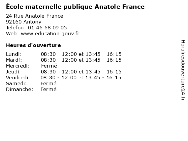 1 École maternelle publique Anatole France (Distance: 9,33 km) 117 Rue Balzac, 94400 Vitry-sur-Seine anatole, cours, education, france, maternelle, publique, services, École, école 2 École Maternelle Publique Anatole France (Distance: 11,94 km) 36 Avenue Anatole France, 94190 Villeneuve-Saint-Georges anatole, cours, education, france, maternelle, publique, services, École, école 3 École maternelle publique Anatole France (Distance: 14,67 km) 5 Rue Pierre et Angèle Le Hen, 94450 Limeil-Brévannes anatole, ecole, education, france, maternelle, publique, services, école 4 École maternelle publique Anatole France (Distance: 16,93 km) 18 Boulevard Abel Cornaton, 91290 Arpajon anatole, cours, france, maternelle, publique, services, école 5 École maternelle publique Anatole France (Distance: 18,79 km) 18 Rue Anatole France, 93100 Montreuil anatole, cours, education, france, maternelle, publique, services, École, école 6 École maternelle publique Anatole France (Distance: 19,76 km) 26 Rue Anatole France, 94490 Ormesson-sur-Marne anatole, ecole, education, france, maternelle, publique, services, école |