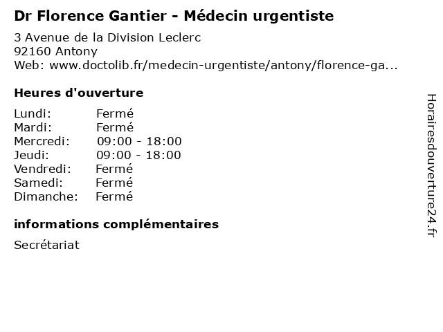 1 Dr Florence Guillemot - Médecin généraliste (Distance: 1,94 km) 2 Allée du Nil, 92160 Antony consultation, docteur, dr, florence, guillemot, généraliste, med, médecin, médecine, secrétariat, traitement 2 Dr Florence Barutciski - Médecin généraliste - secrétariat (Distance: 2,78 km) 126 Avenue du Général Leclerc, 92340 Bourg-la-Reine barutciski, consultation, docteur, dr, florence, généraliste, med, médecin, médecine, secrétariat, traitement 3 Florence Adolphi - Masseur-kinésithérapeute (Distance: 4,21 km) 10 Bis Rue du Séminaire, 94550 Chevilly-Larue adolphi, docteur, florence, generaliste, kinésithérapeute, masseur, medecin, mme, sante 4 Dr Florence Mignon - Chirurgien-dentiste - secrétariat (Distance: 4,37 km) 1 Villa des Camélias, 92350 Le Plessis-Robinson chirurgien, consultation, dentiste, docteur, dr, florence, med, mignon, médecin, médecine, secrétariat, traitement 5 Dr Olivier Checroun - Médecin urgentiste - secrétariat (Distance: 9,23 km) 20 Avenue Pierre Lefaucheux,, 92100 Boulogne-Billancourt checroun, dr, médecin, médecins, médicaments, olivier, santé, secrétariat, spécialiste, urgentiste 6 |