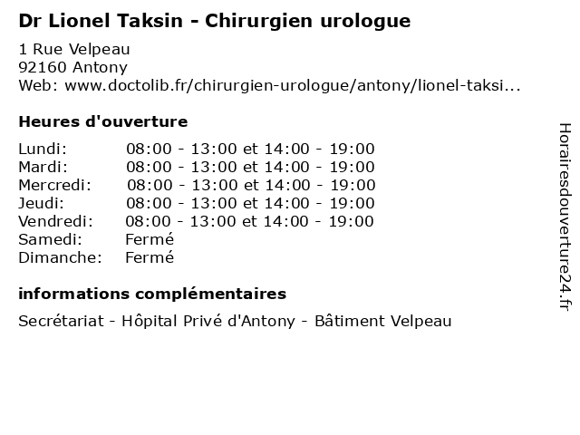 1 Dr Alexis Santy - Chirurgien urologue (Distance: 0,00 km) 1 Rue Velpeau, 92160 Antony alexis, chirurgie, chirurgien, dr, general, santy, soins, urologue 2 Dr Norman Gillion - Chirurgien urologue (Distance: 0,00 km) 1 Rue Velpeau, 92160 Antony chirurgien, dr, gillion, medecin, norman, sante, soins, urologue 3 Dr Stéphane Gripon - Chirurgien urologue (Distance: 0,00 km) 1 Rue Velpeau, 92160 Antony chirurgien, docteur, dr, gripon, général, medecin, sante, services, stephane, stéphane, urologue 4 Dr Yannick Rouach -Chirurgien urologue (Distance: 0,27 km) 41 Avenue Aristide Briand, 92160 Antony chirurgie, chirurgien, dr, general, rouach, soins, urologue, yannick 5 Dr Xavier Hurtes - Chirurgien urologue (Distance: 5,15 km) - avenue du Luxembourg, 94320 Thiais belle épine, chirurgien, dr, hurtes, médical, secrétariat, thiais, urologie, urologue, xavier 6 Dr Lise Majorlaine Kamdoum-Nanfack - Urologue (Distance: 5,17 km) 112 Avenue du Général de Gaulle, 94320 Thiais docteur, dr, dr., kamdoum, lisa, lise, majorlaine, medecins, nanfack, sante, urologique, urologue  |