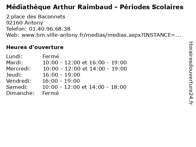 | Mercredi | 10:00-12:00 et 14:00-19:00 |