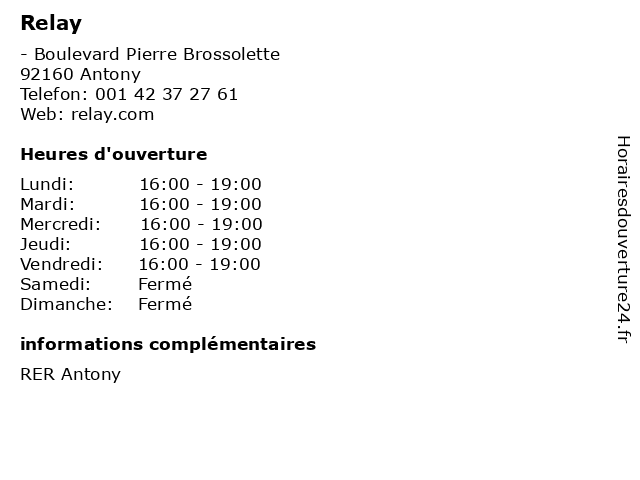 1 Relay (Distance: 0,21 km) n/a Place Auguste Mounie, 92160 Antony café, journaux, magasines, presse, relay, sandwiches, viennoiseries 2 Relay (Distance: 2,85 km) n/a Place de la Gare, 92340 Bourg La Reine beverages, food, gifts, paper, printing, relay, service products, telephone 3 Relay (Distance: 2,86 km) n/a Robinson, 92330 Sceaux beverages, food, gifts, paper, printing, relay, service products, telephone 4 Relay (Distance: 4,73 km) n/a Massy Palaiseau, 91300 Massy beverages, food, gifts, paper, printing, relay, service products, telephone 5 Relay (Distance: 5,89 km) 17 Avenue De Stalingrad, 94800 Villejuif beverages, food, gifts, paper, printing, relay, service products, telephone 6 Relay (Distance: 6,00 km) 220 Avenue de la République, 92320 Châtillon café, journaux, magasines, presse, relay, sandwiches, viennoiseries |