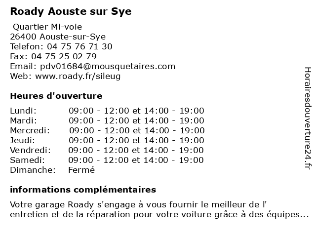1 Roady Tain-l'Hermitage (Distance: 41,03 km) . Zone d'Activité des Lots, 26600 Tain-l'Hermitage centre, entretien, garage, l'hermitage, roady, réparation, tain 3 Roady Aubenas (Distance: 51,80 km) ZA-PONSON-MOULON ROUTE-DE-MONTELIMAR, 07200 Aubenas aubenas, roady |
