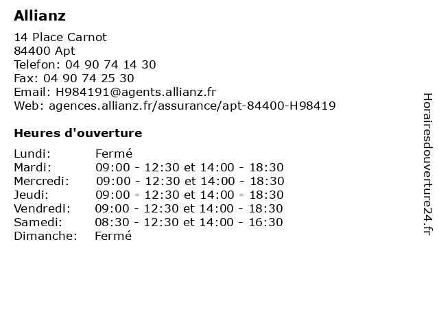 1 Allianz (Distance: 0,30 km) 262 Cours Lauze de Perret, 84400 Apt allianz, assurance prêt, assurances, services 4 Allianz (Distance: 31,87 km) 79 Avenue de Lattre de Tassigny, 04100 Manosque agence, allianz, assurances 5 Allianz (Distance: 35,27 km) 420 boulevard Ledru Rollin, 13300 Salon de Provence agence, allianz, assurances 6 Allianz (Distance: 35,64 km) - Place martin bret, 04300 Forcalquier agence, allianz, assurance auto, assurance habitation, assurance vie, conseil auto, conseil habitation |