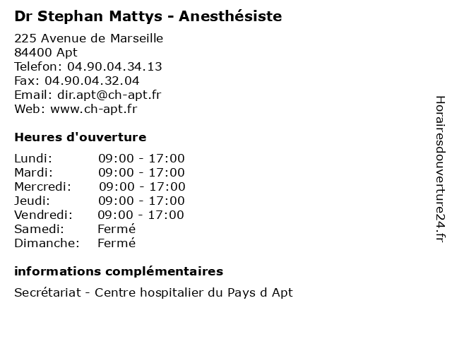 1 Dr André Gabry - Anesthésiste (Distance: 0,00 km) 225 Avenue de Marseille, 84400 Apt andre, andré, anesthésiste, consultation, docteur, dr, gabry, med, médecin, traitement 2 Dr Stephan Pommier - Ophtalmologue (Distance: 27,28 km) 1 bis Quai des Lices Berthelot, 84800 L’Isle-sur-la-Sorgue dr, ophtalmologie, ophtalmologistes, ophtalmologue, pommier, stephan, vision 3 Lucibello Stephan (Distance: 35,41 km) 683 Boulevard du Roi René, 13300 Salon-de-Provence lucibello, stephan 4 Dr Stephan Chamati - Radiologue (Distance: 38,80 km) 38 Bis Cours des Arts et Métiers, 13100 Aix-en-Provence aix, arqad, centre, chamati, d'imagerie, diagnostique, dr, en, imagerie, médicale, provence, radiologie, radiologue, scanner, stephan, thérapeutique 5 Dr Grégory Stephan - Chirurgien-dentiste (Distance: 39,09 km) 33 bis Boulevard de la République, 13100 Aix-en-Provence chirurgien, consultation, dentiste, docteur, dr, grégory, santé, stephan 6 Dr Stephan Chamati - Radiologue (Distance: 41,75 km) 235 Allee Nicolas Stael, 13080 Aix-en-Provence chamati, d'aix, de, diagnostique, dr, imagerie, irm, pays, provence, radiologie, radiologue, stephan, thérapeutique |